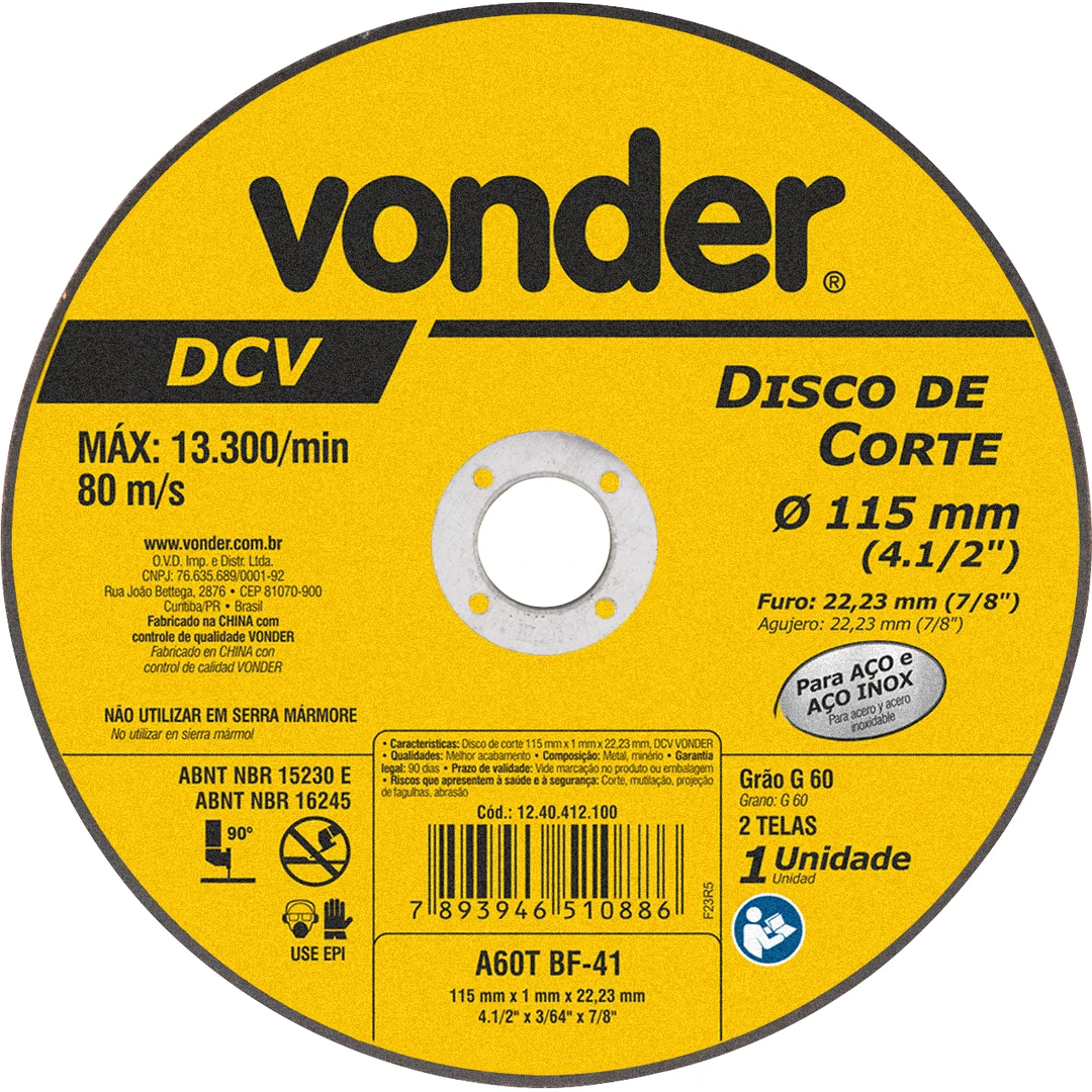 O Disco de Corte Vonder 4.1/2″ (115 mm) é a escolha ideal para cortes rápidos, precisos e com acabamento de qualidade em metais e aço inoxidável. Fabricado com grão abrasivo de alta performance, garante maior durabilidade e eficiência no uso, reduzindo a geração de calor e rebarbas durante o corte.