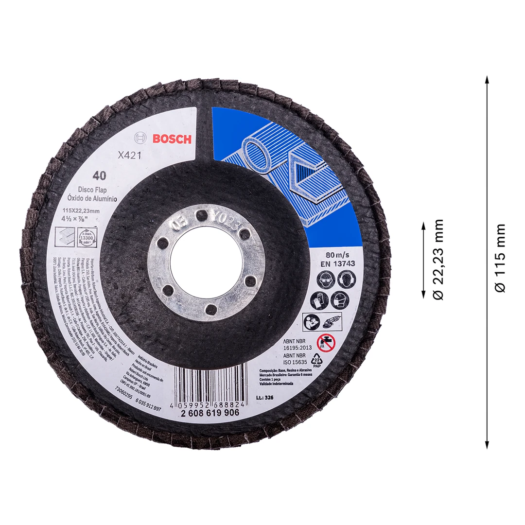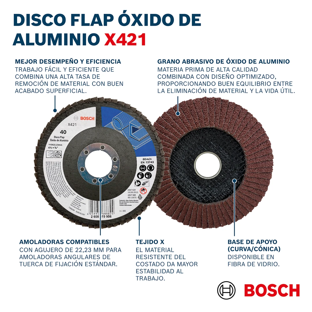 O Disco Flap Bosch X421 oferece excelente desempenho em operações de desbaste, acabamento e remoção de solda. Fabricado em óxido de alumínio, proporciona alta durabilidade, corte preciso e acabamento uniforme.