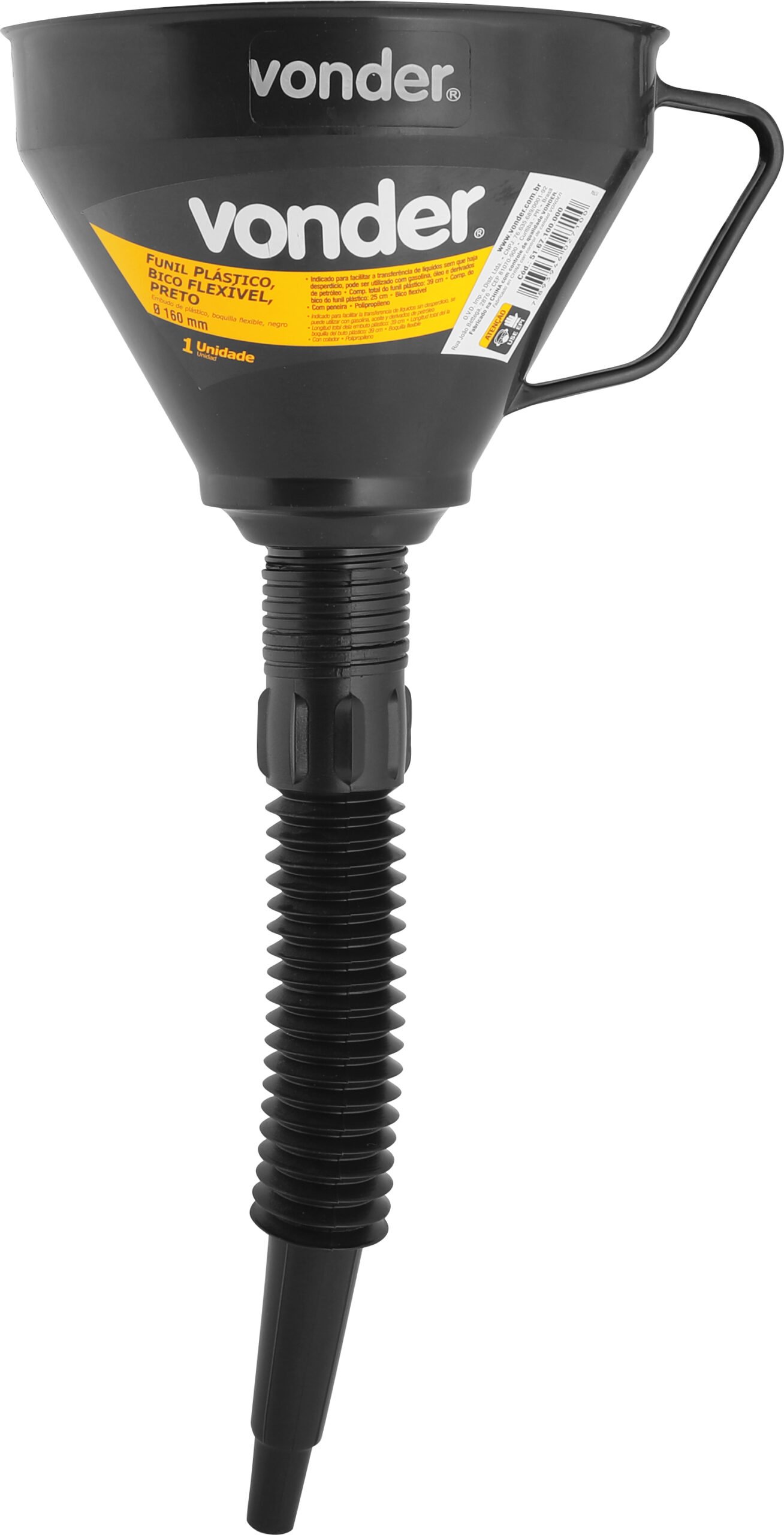 O funil plástico Vonder com bico flexível é ideal para transferências seguras de líquidos como gasolina, óleo e derivados de petróleo, sem desperdícios. Fabricado em polipropileno resistente, conta com alça para manuseio fácil, peneira para filtrar impurezas e bico flexível que permite uso em locais de difícil acesso. Com 160 mm de diâmetro e 39 cm de altura, é a escolha prática e durável para oficinas, postos e uso doméstico.